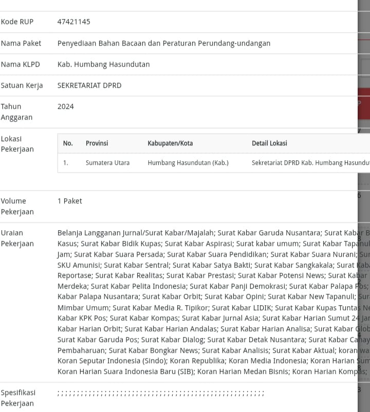 Informasi ini diketahui dari Sistem Informasi Rencana Umum Pengadaan (SIRUP) LKPP Humbahas yang diakses, Rabu (5/2/2025). Proyek tersebut terdaftar dengan kode RUP 47421145, nama paket penyediaan bahan bacaan dan peraturan perundang-undangan.