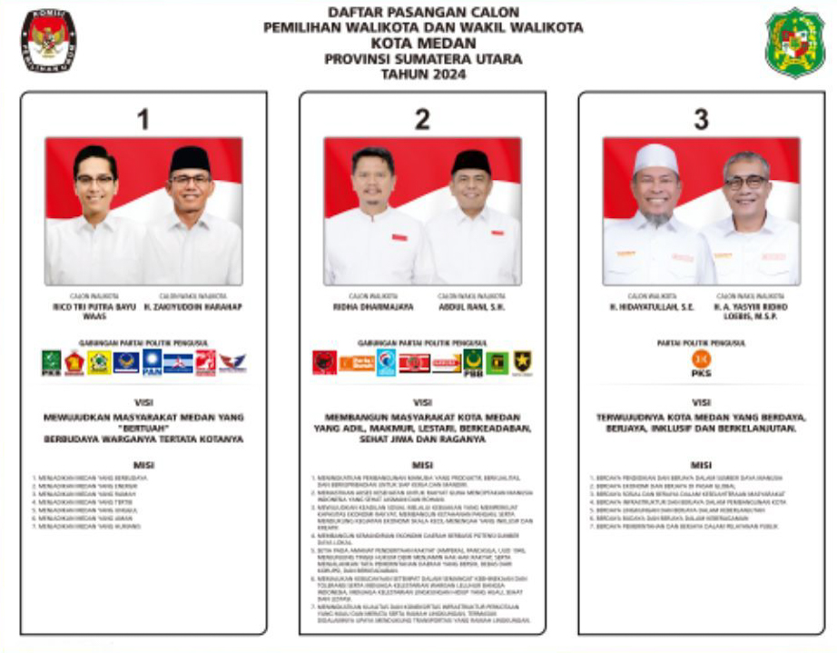MEDAN, ASPIRASI.news – Komisi Pemilihan Umum (KPU) Kota Medan mengagendakan tiga kali pelaksanaan debat kandidat pasangan calon peserta Pilkada Medan 2024.